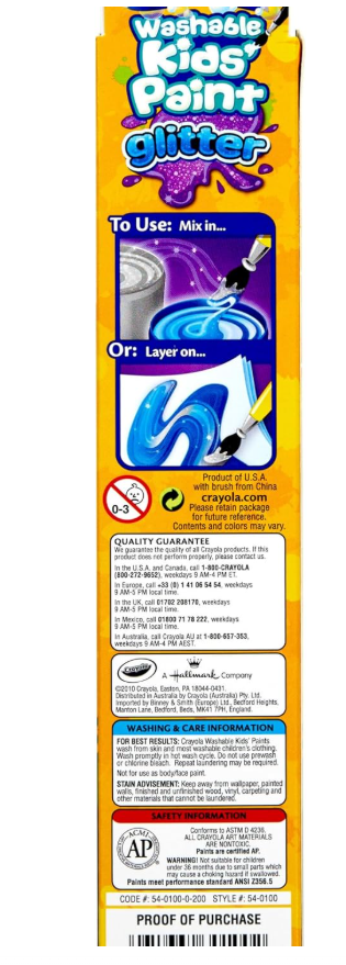 Items Included in Package: 6 washable paint pots, glitter paint mix-ins