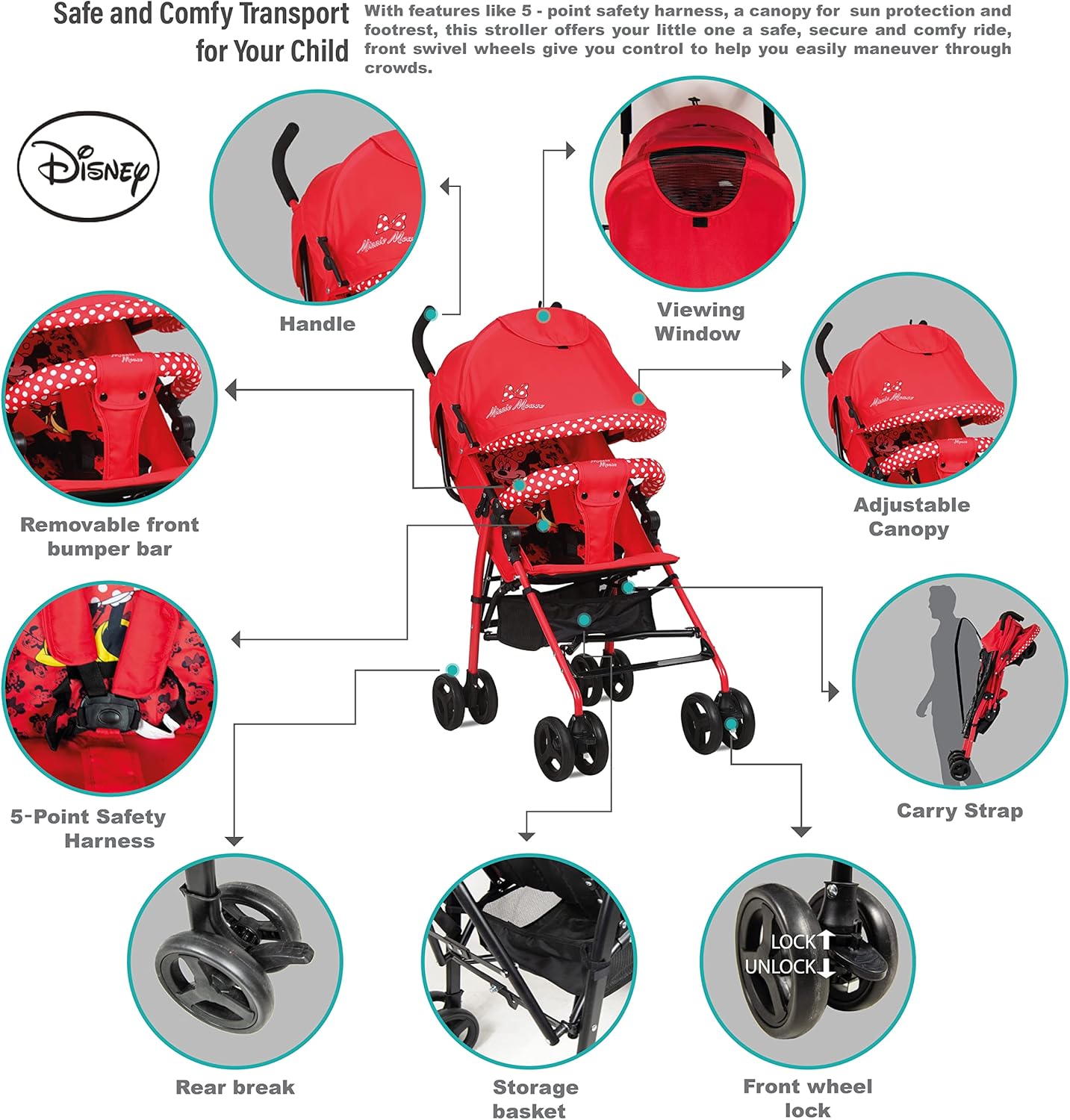 Product Specifications Brand: Disney Model or SKU: B801C Type: Buggy stroller Color: Red, black, white Material: Steel frame, polyester fabric Battery info: Not required Recommended Age: Not specified, suitable for infants and toddlers Weight Limit: Approx. 15 kg Items included in package: 1 x Minnie Mouse Buggy Stroller