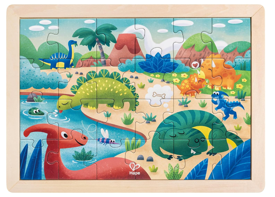 Rrroooaaarrr! Bring the prehistoric world to life with the Hape Dino Reversible Puzzle. This 24-piece set encourages storytelling, problem-solving, and hand-eye coordination. With a vibrant dinosaur scene on one side and a color-in version on the other, it offers double the fun and learning. Crafted from sustainable materials, it’s an eco-friendly choice parents can trust for quality playtime.
