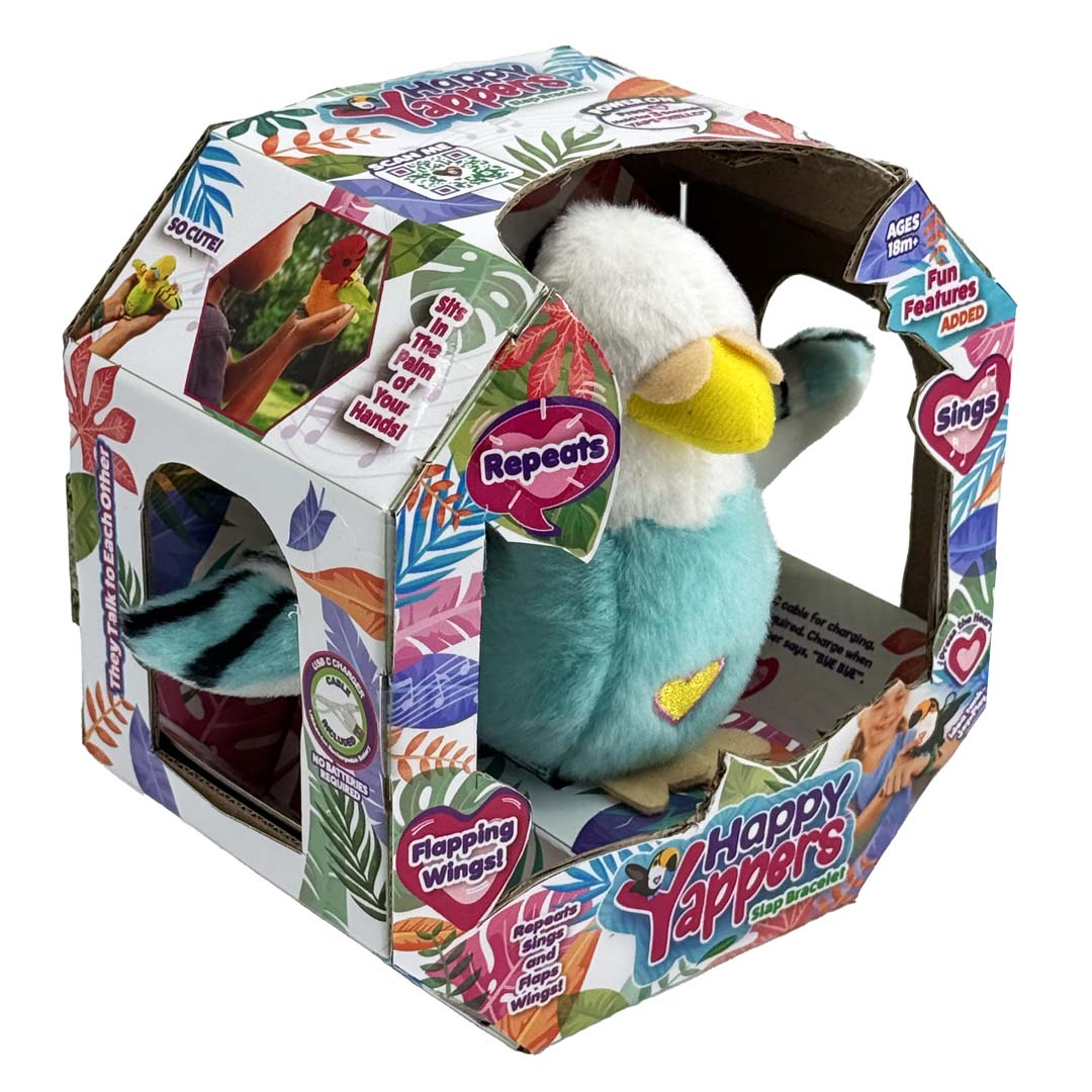 The Happy Yappers S2 Parrot in vibrant turquoise is a fun interactive pet that repeats what you say in a playful voice. Designed to entertain and engage, it responds to speech with amusing sound effects.