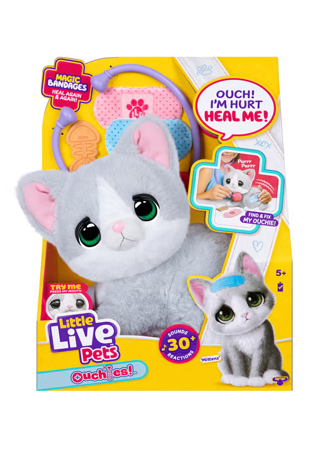 Meet Mittens the Kitten, your soft and snuggly rescue from Little Live Pets Ouchies! Shivering and in need of love, Mittens needs your help to feel better. Use the stethoscope to find where it hurts, place a Velcro bandage, and comfort her back to health. With over 30 adorable sounds and reactions, this interactive plush turns care time into playtime.