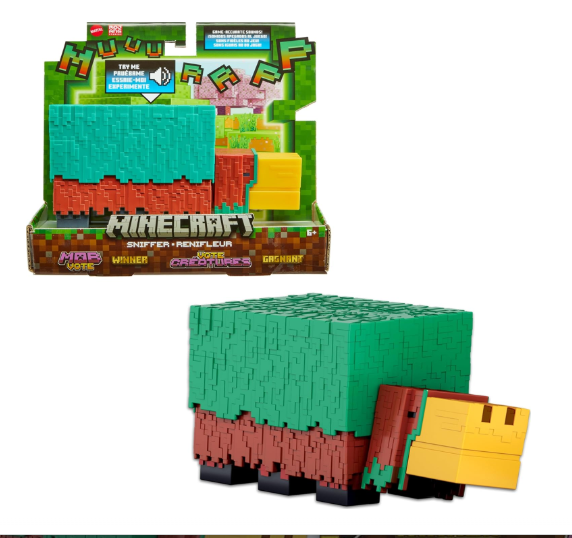 Bring the excitement of the Minecraft community's choice to life with the Minecraft Sniffer Mob Vote Winner Figure. This figure faithfully recreates the massive, mossy creature with its characteristic blocky design and includes sound effects for interactive play. Designed for authenticity and durability, this collectible figure is a fantastic gift for any young gamer and a prized item for dedicated Minecraft fans.