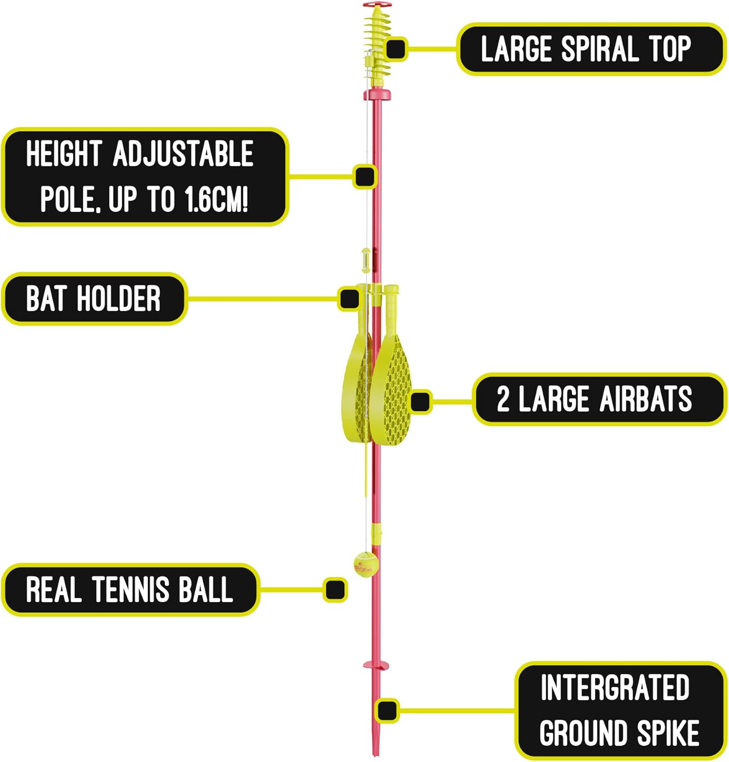 Items Included: 2 airbats, real tennis ball, adjustable pole, base
