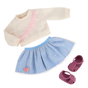 Complete Daily Outfit: Comes dressed in a stylish tulle-appliqué top, pleated skirt, shoes, and undies.