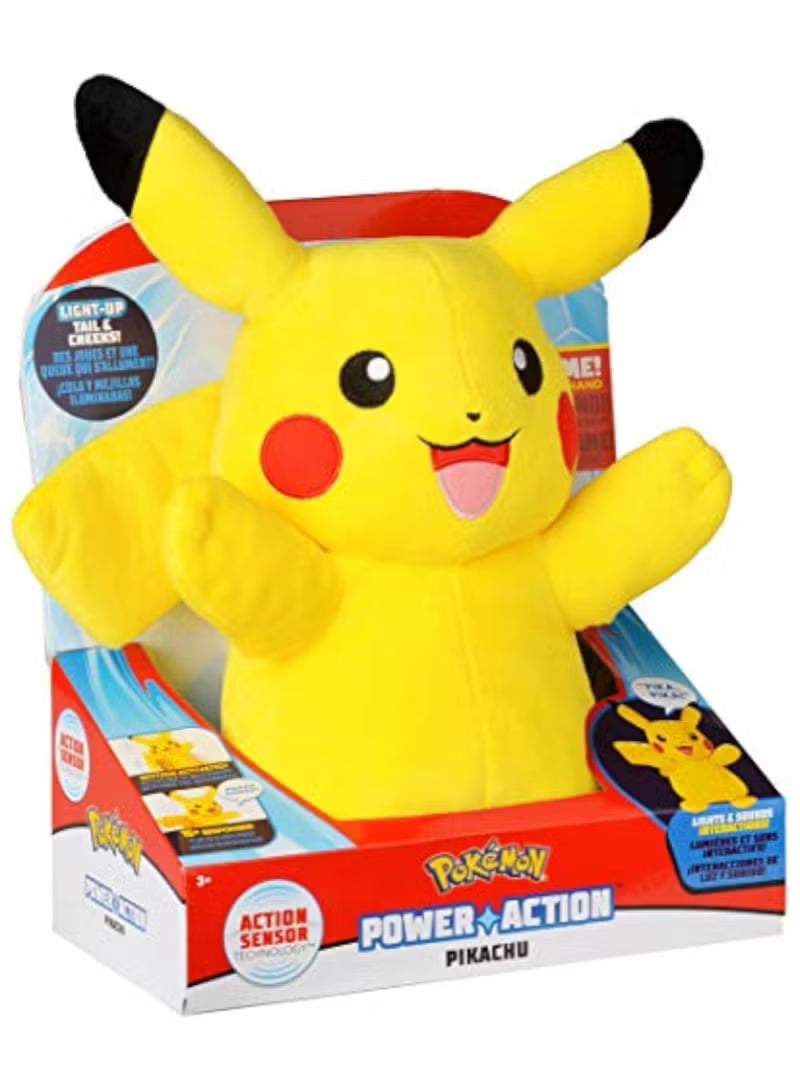 Experience dynamic, battle-ready fun with the Pokémon Power Action Pikachu Plush! This interactive plush brings the Electric-type hero to life with lights, sounds, and an action sensor. Activate the "Action Sensor" technology to trigger over 15 authentic Pikachu phrases and sounds, or press the button to see its light-up tail and cheeks glow with battle energy! This high-quality, engaging plush is the perfect gift for dedicated young trainers and an ideal, trusted interactive toy for the GCC market.