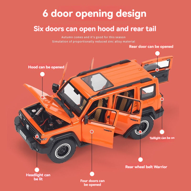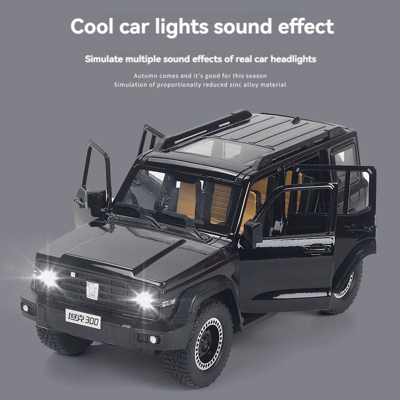 The Tank 300 Diecast Car with Sound is a premium 1:24 scale model designed for both play and display. Featuring a sturdy alloy body, pull-back action, and engaging sound effects, this toy delivers realistic driving fun for children and collectors alike. Its durable construction and safe design make it a trusted choice for GCC families and gift buyers.